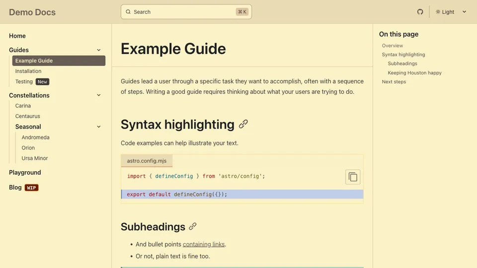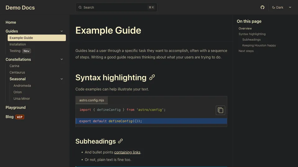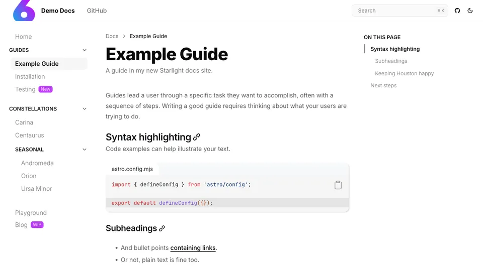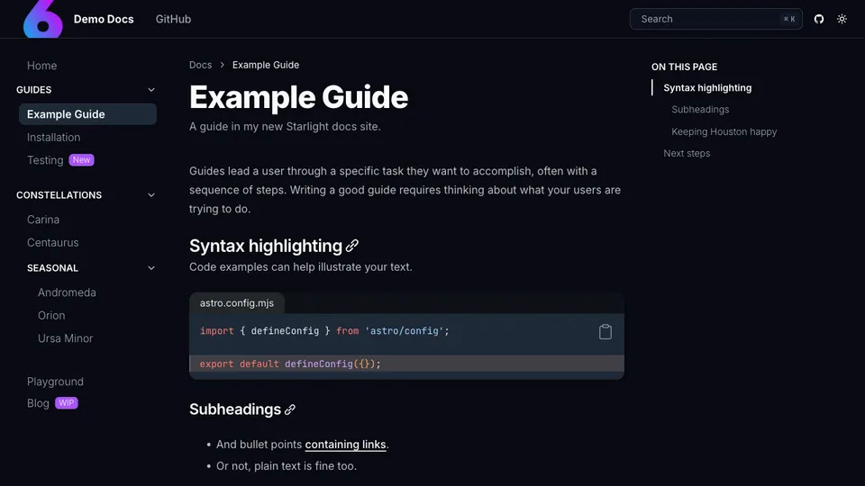 Preview a list of all themes below or try them out interactively on the Starlight Themes demo site.